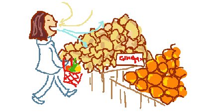 物とか野菜なんて、あーた、どどどどどどってそのまんま山盛りになっておいてあるからイキオイありますわよ。そのなかから自分で好きな形や大きさや新鮮なものを選んで袋に入れてレジにもってくという、そんな仕組み。その中であたくしのお気に入りな売り場があって、それは”生姜”がおいてあるところ。あのねー、想像できるかしらぁ、これでもかっていうくらい目の前にどーんっとショウガが山積みになってるもんだから、そこの前に行くと、必ず深呼吸するのさっ、ふふふ。だって、とってもいいニオイじゃない?なんかこう健康的なさ。鼻からすってすってすいまくって、口で吐く。そうすると食べてもないのに、ショウガの成分が体中にゆきわたるカンジがしてさ。形はへんちくりんだけど、効果
